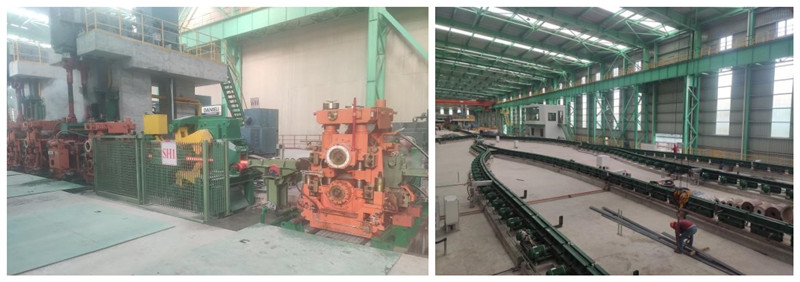 龍騰特鋼高速端板法蘭生產線是國內采用全連軋工藝生產的高速端板法蘭軋鋼生產線,產品涵蓋國內外端板法蘭的絕大部分規格要求。通過雙蓄熱步進式加熱爐加熱后,鋼坯進入11臺平立交替布置的高剛度短應力線軋機,實現全連續無扭軋制。通過我院專利設備浮動式夾送輥和平立轉換裝置,不同規格的端板法蘭扁鋼可在軋制完成后實現快速平轉立,并通過轉轍器及卷前輥道分別輸送至6臺卷取機進行卷取。生產線配備先進的自動控制系統,對全線物流進行跟蹤,實現工藝過程的自動化。先進的設備與合理的工藝流程,大大提高了生產線的生產效率和成材率,預計年產量可達50萬噸。